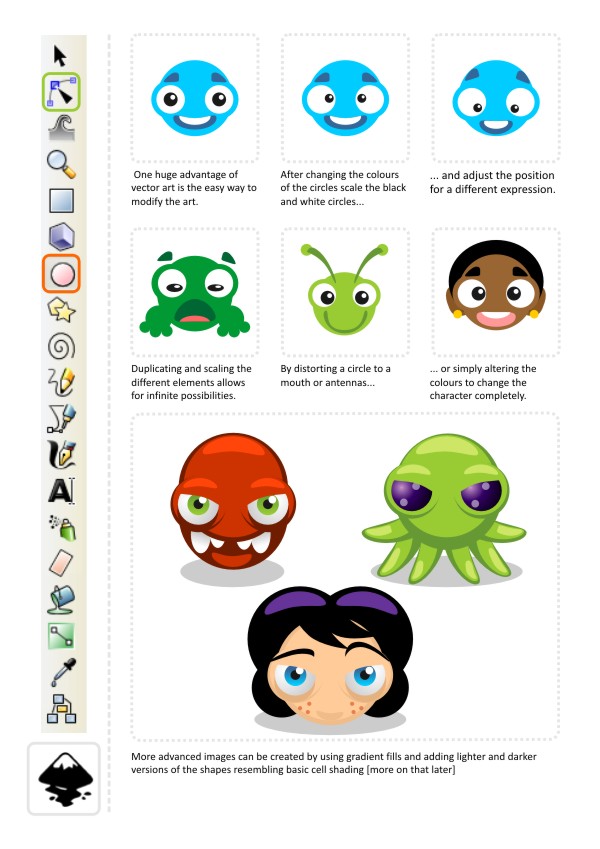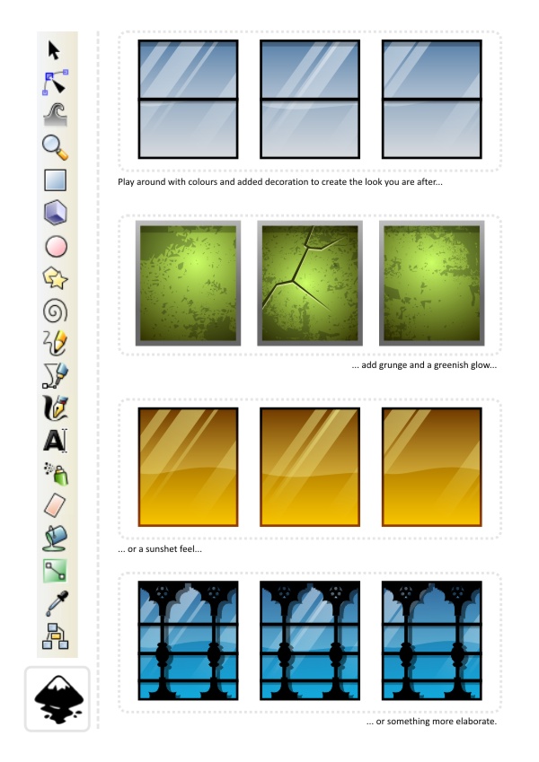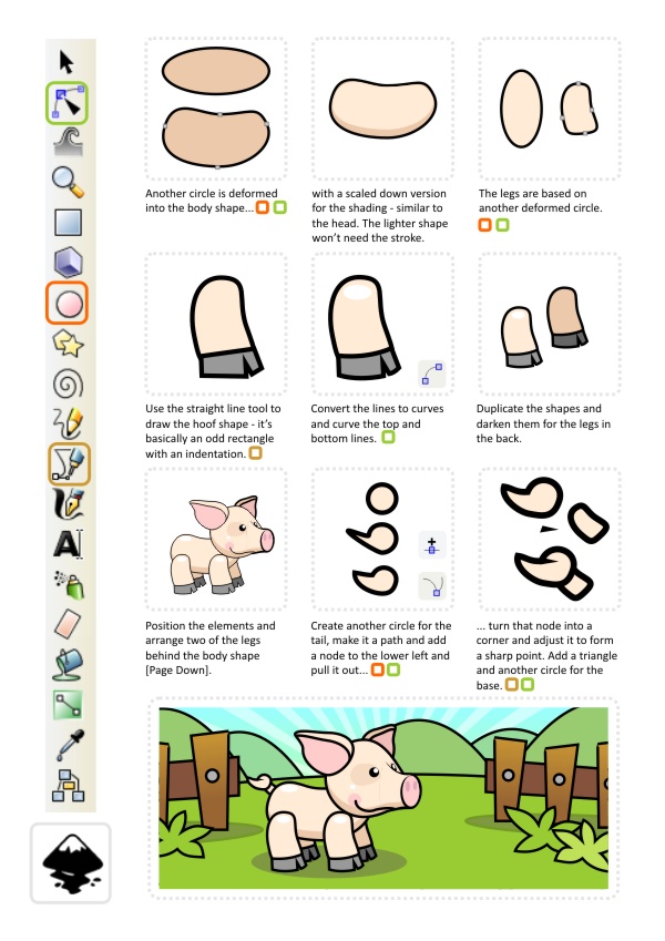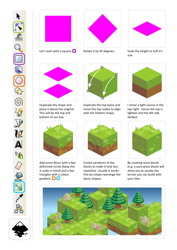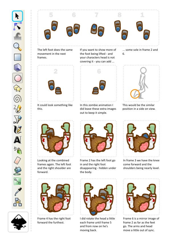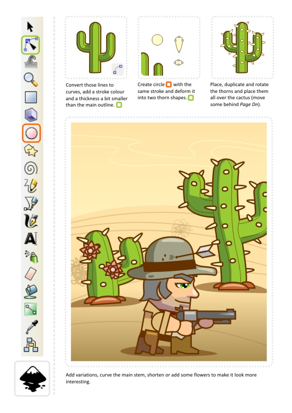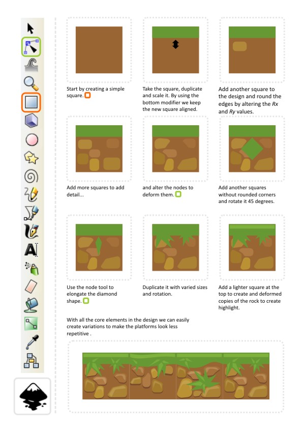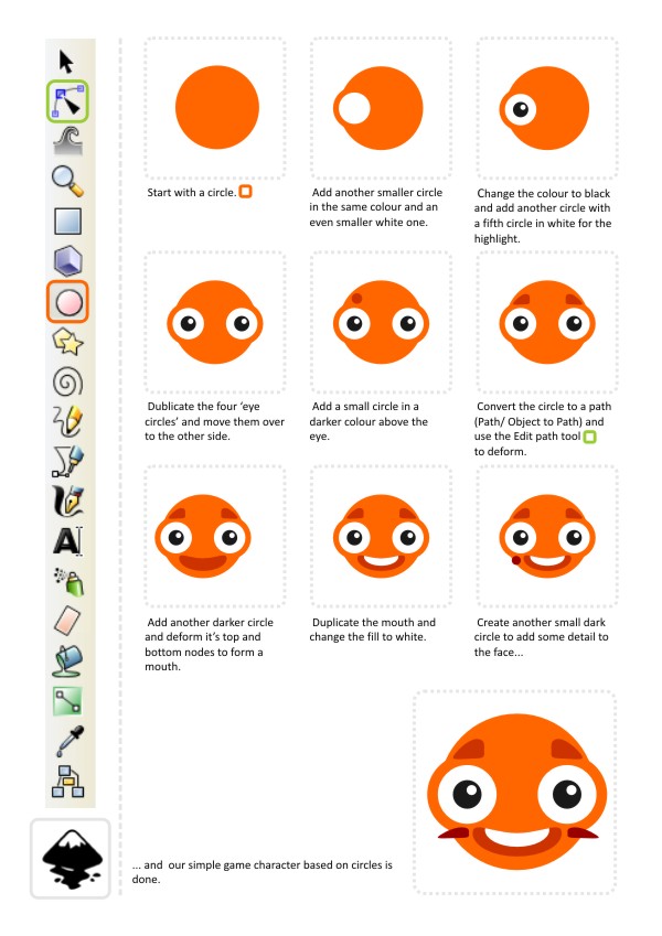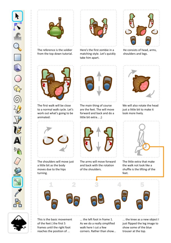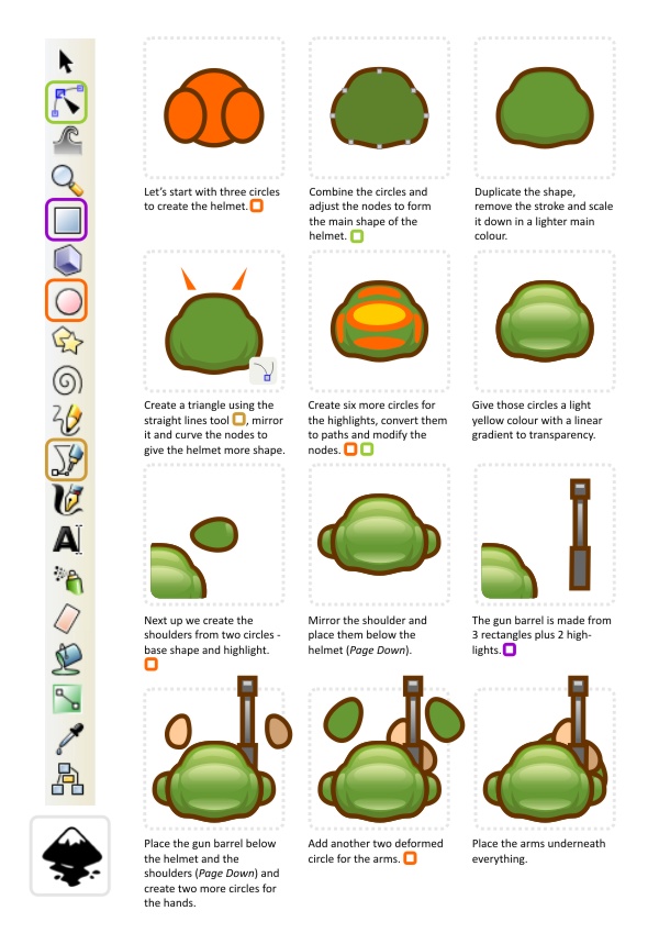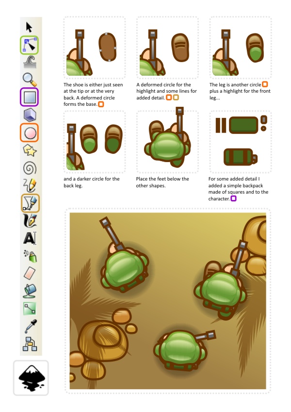 Pensando no desenvolvimento de jogos, o site 2D Game Art for Programmers possui vários post que ensinam a criar personagens e vários outros elementos para jogos 2D utilizando a ferramenta inKscape e GIMP. A galeria de arquivos a seguir representam apenas alguns dos tutoriais presentes no site 2D Game Art.